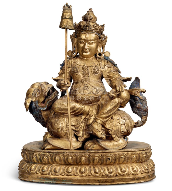 ▲鎏金铜财宝天王坐像,其左手握吐宝鼠。(图片来源:中国国家博物馆)