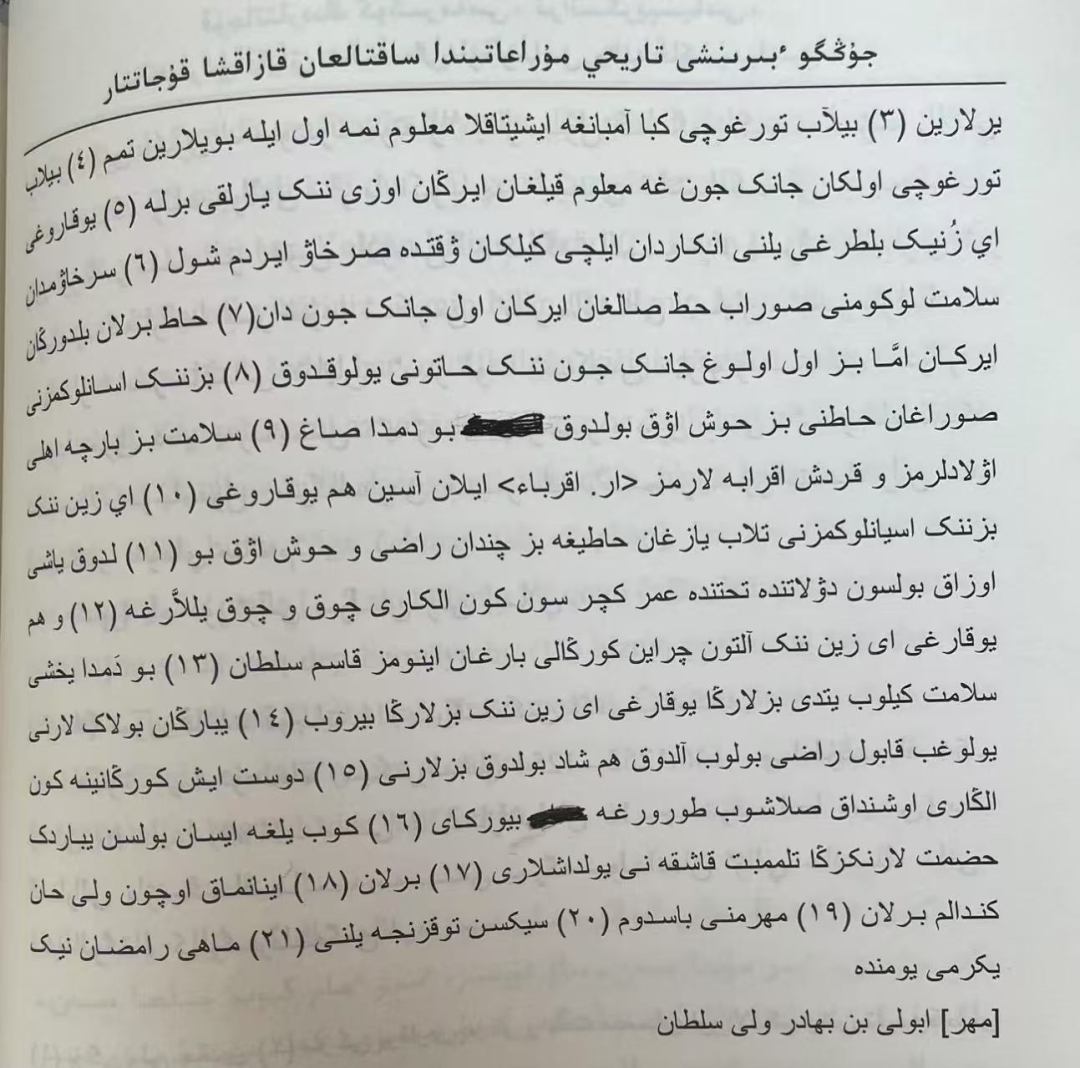 ▲伊犁将军保宁写于乾隆五十四年十月奏折中所附阿布莱汗之子巴哈杜尔瓦里苏勒坦之信。(图片来源:杜山那里·阿布都西拉木,《中国第一历史档案馆藏清代哈萨克语文献研究》(哈萨克文),民族出版社,2016年版)