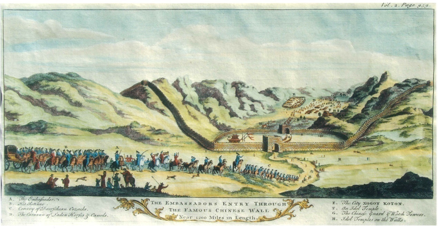 ▲17世纪末,俄国使团来华途经长城的关口。(图片来源:[荷] 伊兹勃兰特·伊台斯,[德] 亚当·勃兰德著《俄国使团使华笔记(1692—1695)》)