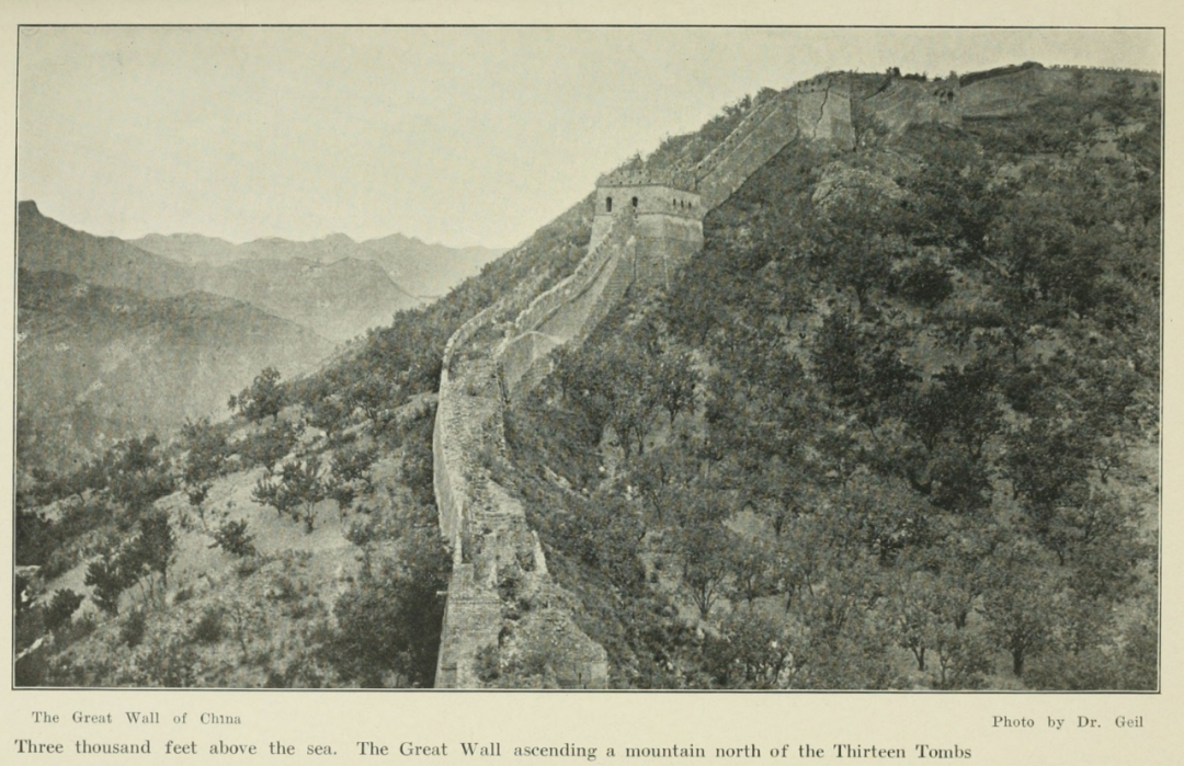 ▲盖洛拍摄的长城:在海拔3000英尺(约914米)的高空,长城蜿蜒攀升于十三陵以北的群山之上。(图片来源:威廉·埃德加·盖洛1909年出版的The Great Wall of China(《中国长城))