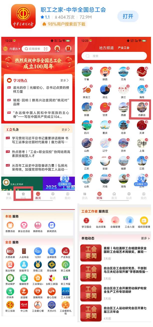 自2024年7月1日全国总工会“职工之家”APP上线运行以来,内蒙古自治区总工会党组高度重视,采取多种措施,在全区工会干部和职工群众中不断加大推广应用力度,同时积极做好自治区总工会“北疆工惠”APP与“职工之家”APP的融合贯通、联动使用工作,正在形成进“大家”找“小家”、进“小家”找“大家”,“大家”、“小家”是一家的良好网上工作局面。目前,已在“职工之家”APP的“矩阵”→“地方频道”上线了展示内蒙古工会工作和维权服务活动特色的频道——“内蒙古总工会”!欢迎全区各级工会干部和各行各业的职工群众打卡关注。
