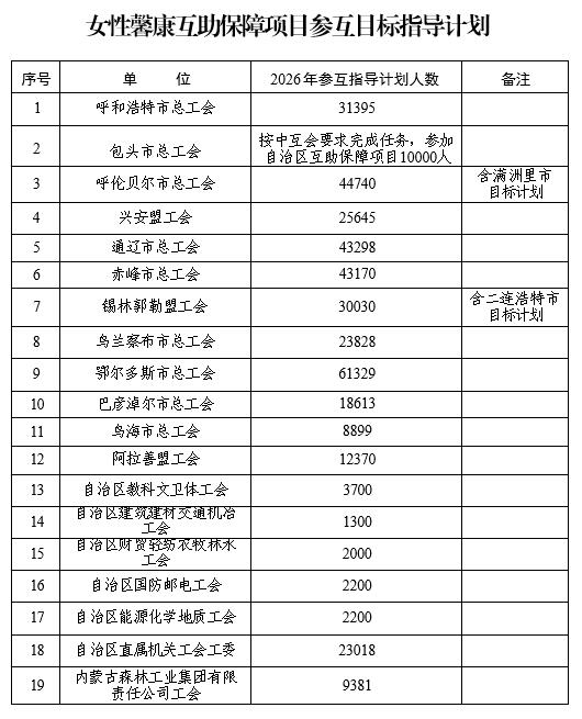 为深入学习贯彻习近平新时代中国特色社会主义思想,始终坚持竭诚服务职工群众的鲜明导向,认真落实自治区总工会党组对职工互助保障工作的各项要求,不断推进全区职工互助保障工作扩面提质,继续做大做优职工住院医疗互助保障项目和女性馨康互助保障项目,2026年度职工互助保障项目在2025年度基础上进一步优化升级,于2025年7月开始接受办理。现就有关事项通知如下。