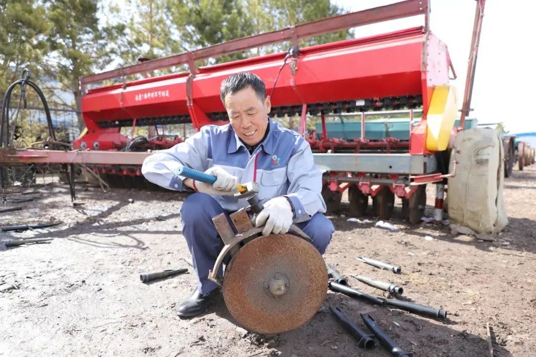 闫顺利正在检修播种机。陈晓娟 胡文龙 摄