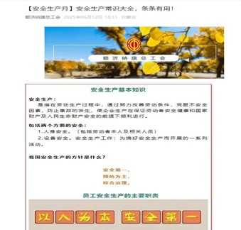 额济纳旗总工会充分发挥新媒体传播优势,在微信公众号转发全国“安全生产月”主题宣传片、公益广告,“九小场所”安全生产月专属海报,“安全生产月”主题海报和《关于开展2025-2026年度全国“安康杯”竞赛活动的通知》,涵盖法规解读、案例警示、应急技能等内容。同时,阵地宣传全面覆盖,在职工服务中心办事大厅、工会驿站等场所发放安全生产相关宣传册200余份,实现宣传触角向基层末梢延伸,实现了线上线下宣传全覆盖。