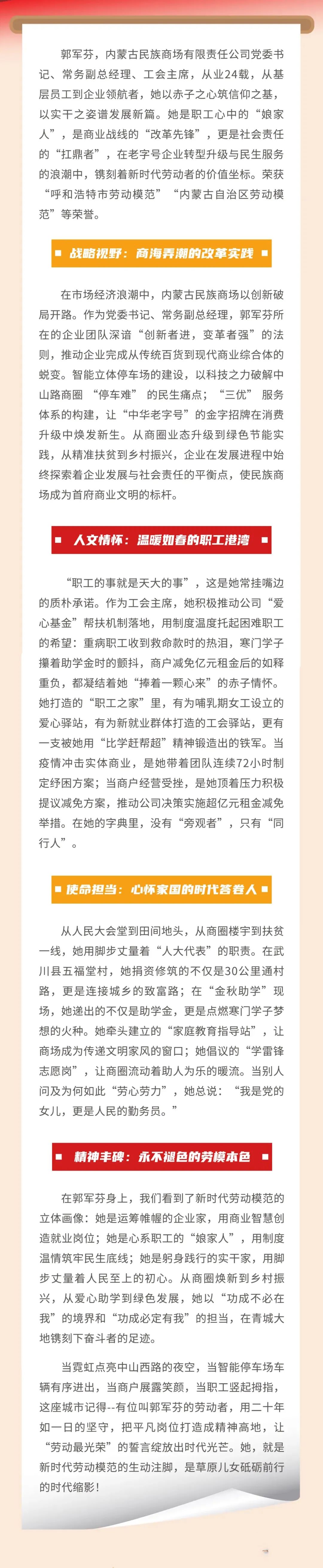 商海弄潮担使命 工会为桥系民心——记内蒙古自治区劳动模范、内蒙古民族商场有限责任公司党委书记、常务副总经理、工会主席郭军芬
