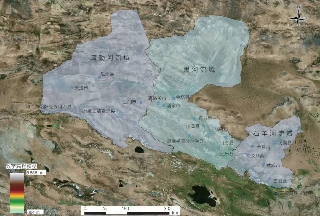 ▲河西走廊黑河、疏勒河、石羊河流域分布图。(图片来源:中国科学院院刊微信公众号)