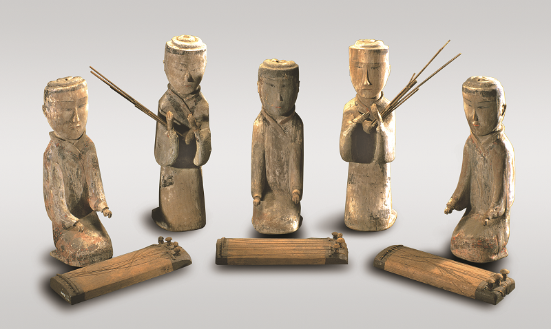 ▲西汉奏乐木俑,其中2个吹竽,3个鼓瑟。马王堆一号汉墓出土,湖南博物院藏。(图片来源:湖南博物院官网)