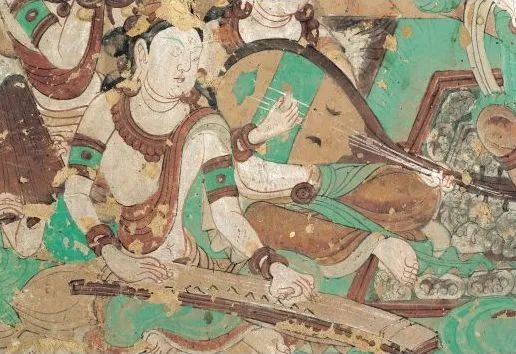 ▲唐代,筝已成为了弹弦类的乐器之首,敦煌壁画上也难寻瑟的身影。图为莫高窟第112窟北壁西侧(中唐)乐舞图中的琵琶与筝。(图片来源:敦煌研究院)