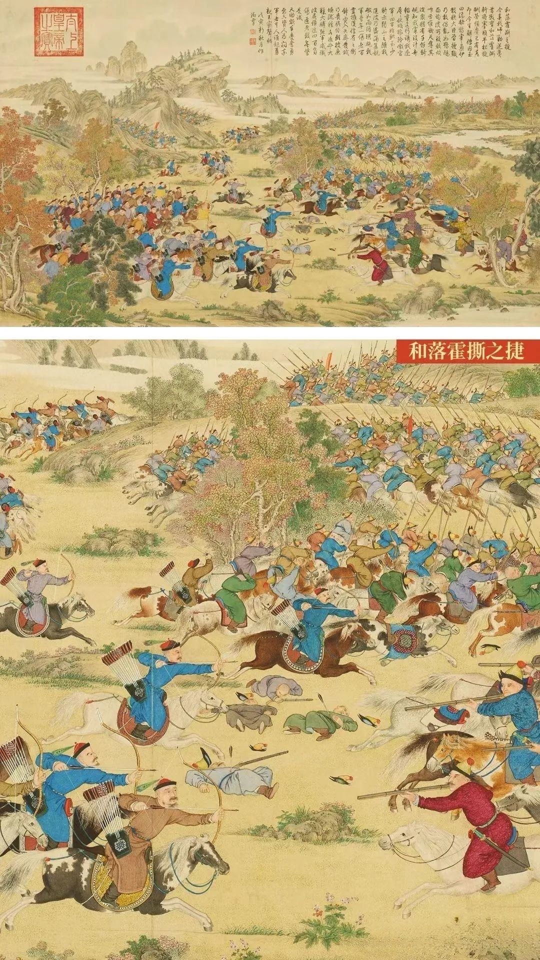 ▲图为《平定西域战图》画页,是乾隆平定准噶尔部叛乱中的作战场景。乾隆在平定准噶尔和大小和卓叛乱后,废除了新疆地区的伯克世袭制,其任免权收归中央。新疆各部的札萨克王也开始受到朝廷大臣的牵制。(图片来源:故宫博物院)