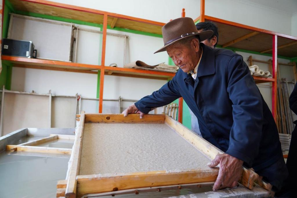 ▲尼木藏纸技艺传承人次仁多杰进行浇造、抄纸工艺步骤。(图片来源:新华网)