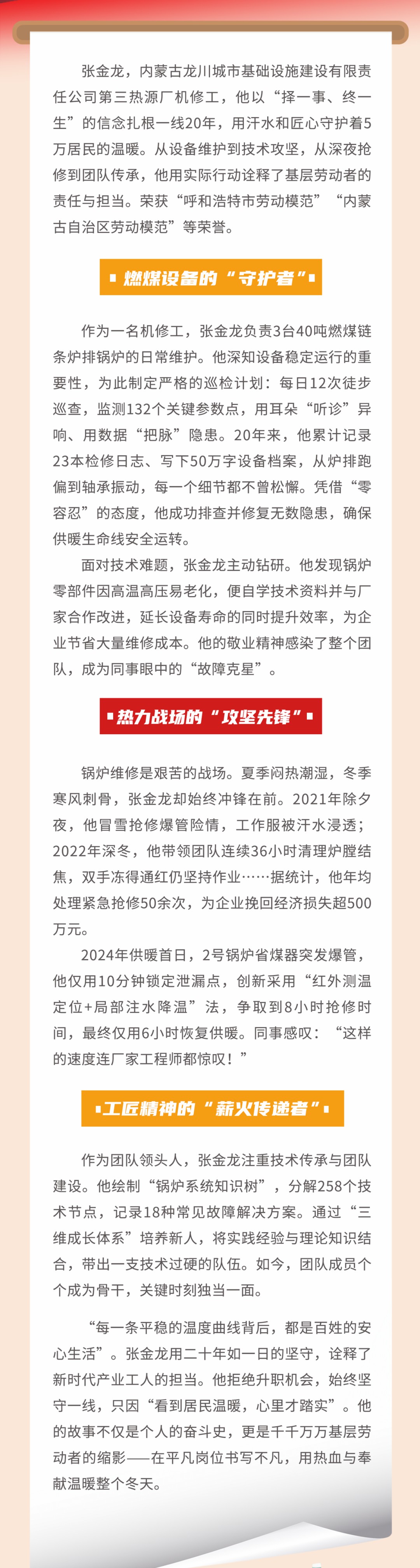 坚守岗位“热力”战场 用钢铁之躯铸就供热新篇 ——记内蒙古自治区劳动模范、内蒙古龙川城市基础设施建设有限责任公司第三热源厂机修工张金龙