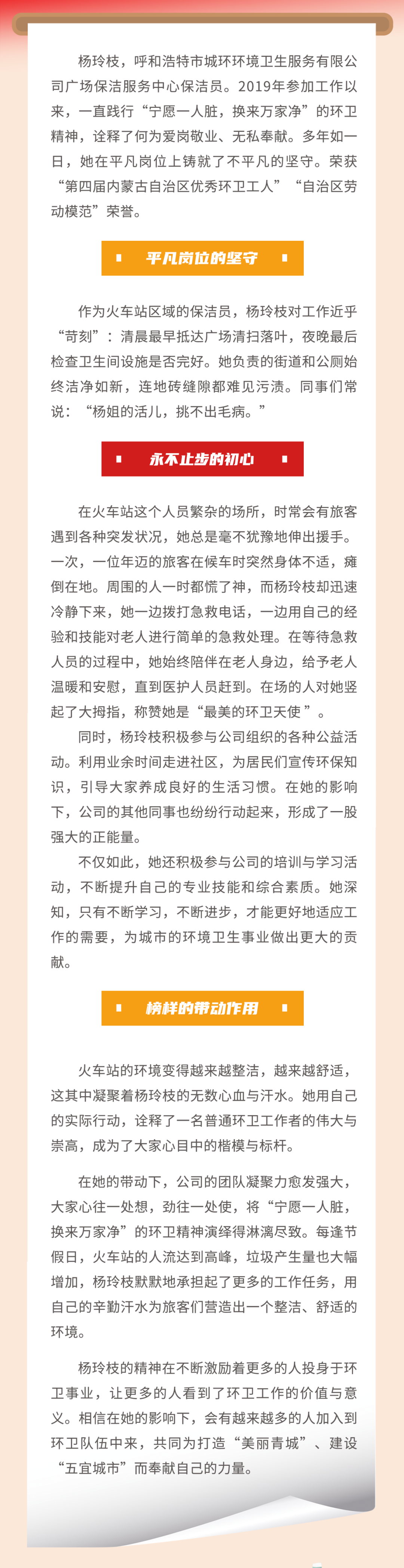 扫帚为笔写初心 微光成炬照青城——记内蒙古自治区劳动模范、呼和浩特市城环环境卫生服务有限公司广场保洁服务中心保洁员杨玲枝