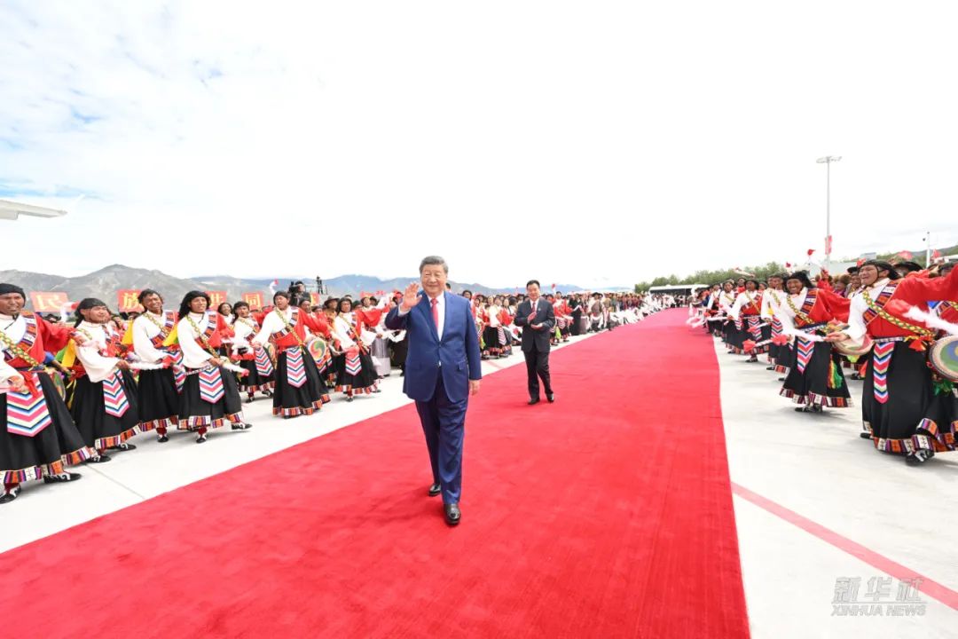 习近平离开西藏时,各族群众纷纷来到拉萨市区的沿途道路两旁,挥舞红旗、手捧哈达,欢呼着向总书记问好,向总书记表达由衷的爱戴。拉萨贡嘎机场,身着节日盛装的干部群众挥舞着红旗和花束,载歌载舞,高喊“扎西德勒”,表达高原儿女对以习近平同志为核心的党中央的感激之情、对建设社会主义现代化新西藏的坚定信心。