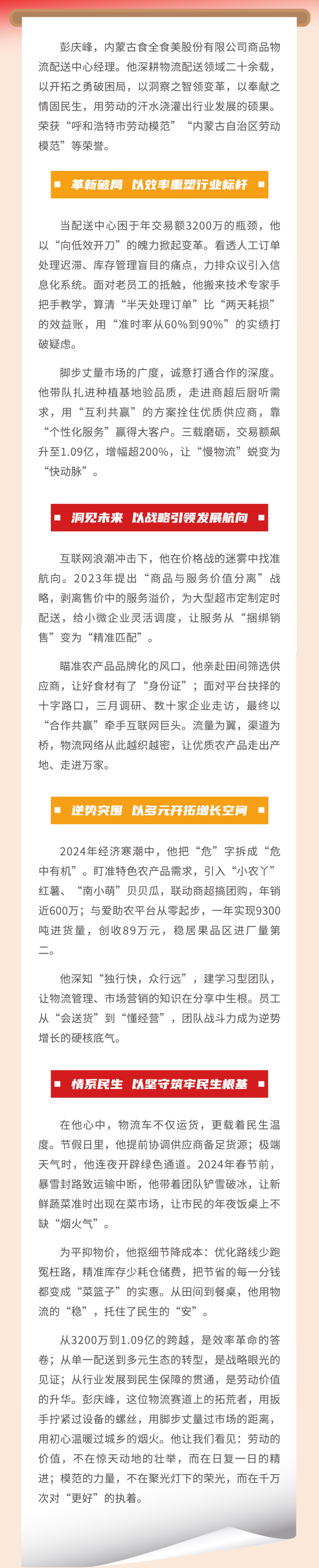 物流赛道上的拓荒者——记内蒙古自治区劳动模范、内蒙古食全食美股份有限公司商品物流配送中心经理彭庆峰