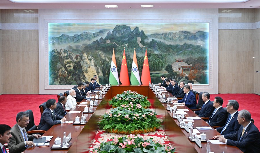 8月31日中午,国家主席习近平在天津迎宾馆会见来华出席2025年上海合作组织峰会的印度总理莫迪。新华社记者 谢环驰 摄