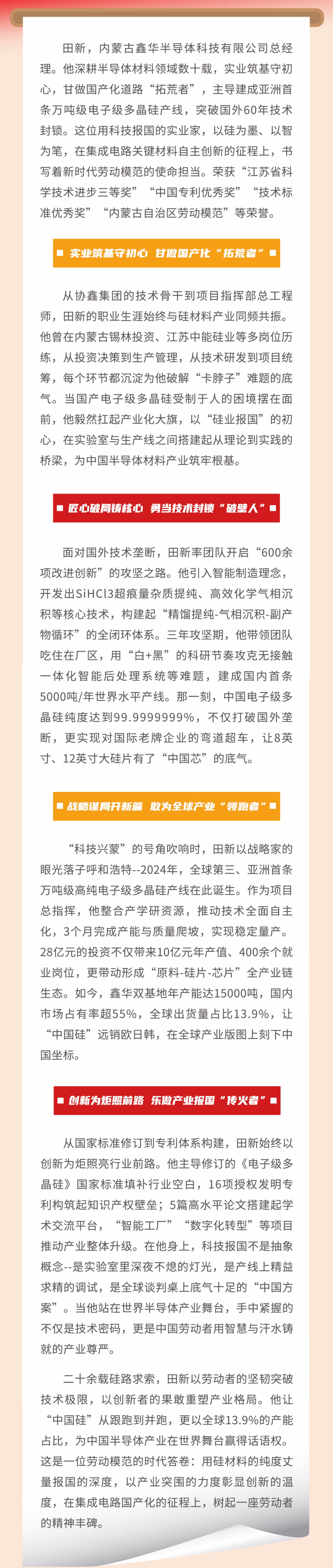 半导体材料国产化征程上的“硅”魂筑梦者——记内蒙古自治区劳动模范、内蒙古鑫华半导体科技有限公司总经理田新