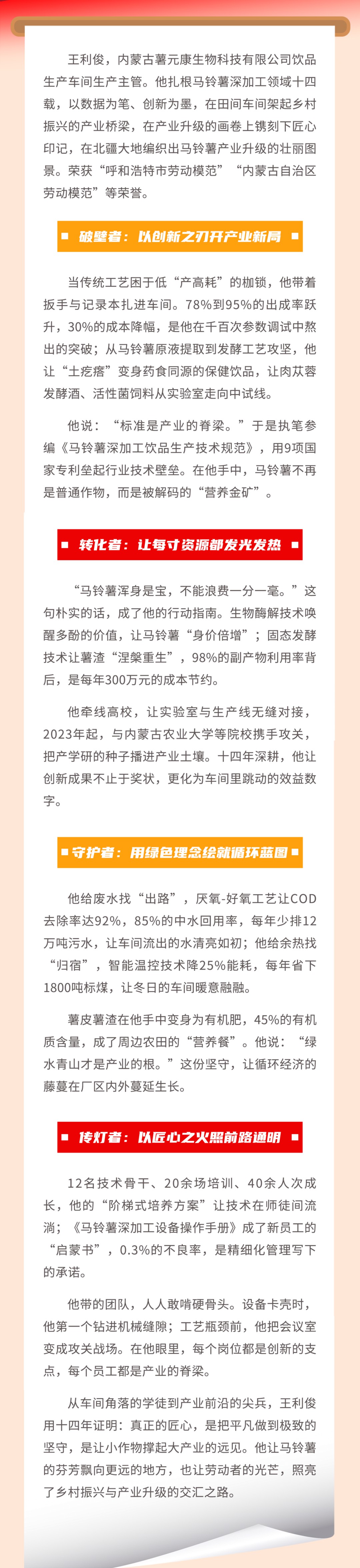 薯业匠心十四载 一腔赤诚铸丰碑——记内蒙古自治区劳动模范、内蒙古薯元康生物科技有限公司饮品生产车间生产主管王利俊