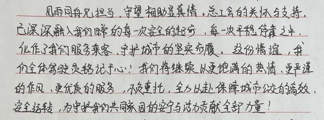 风雨同舟见担当,守望相助显真情。近日,鄂温克族自治旗总工会收到来自呼伦贝尔中心城公共汽车有限公司102路线全体驾驶员的亲笔感谢信及锦旗。2025年6月,为切实改善一线公交车司机的工作休息条件,营造尊重关爱劳动者的良好氛围,旗总工会为102公交车终点站司机休息室采购并配发了一批服务用品设施,以实际行动传递党和政府关怀及工会“娘家人”的温暖。