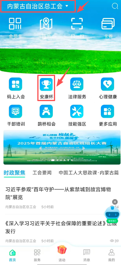 2、进入“北疆工惠”APP后,点击首页上方工会切换至内蒙古自治区总工会,点击首页【安康杯】进入线上答题系统。