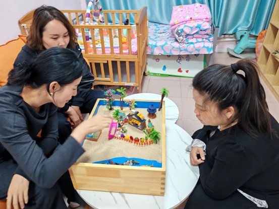 一沙一世界,一盘一心境。女职工们专注地摆放着沙具,细致地抚平沙粒,在无声的创作中梳理情绪、表达自我。心理老师则通过观察她们选择沙具的类型、摆放的位置、构建的场景以及过程中的细微反应,进行非干预性的陪伴与分析,初步解读其潜意识中的情绪状态、压力来源及内在需求。