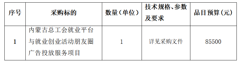 内蒙古自治区总工会现就“内蒙古总工会就业平台与就业创业活动朋友圈广告投放服务”项目采用竞争性谈判方式进行采购,欢迎符合资格条件的供应商参与。