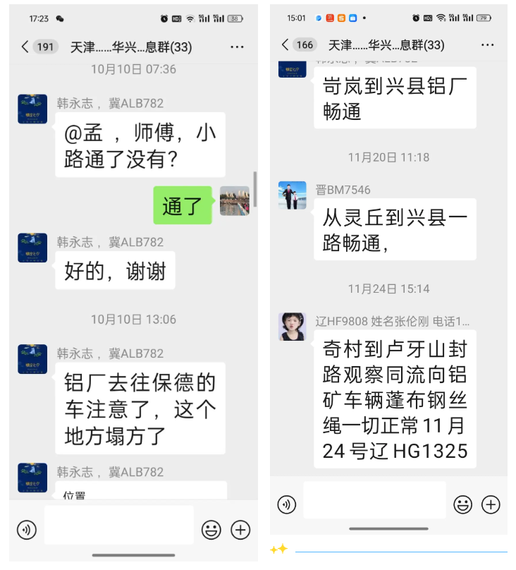 “杨平到兴县还有十几公里,下雨,道路塌方堵车。”“保德方向通行恢复。”“岢岚与兴县交界处路况正常。”……打开中铝物流内蒙古公司天津—华兴铝土矿路况信息群,一条条带着现场画面的实时路况播报不停刷新。这些由货车司机拍摄的路况小视频,如今已成为2000余名货车司机的“出行指南”。这背后,是中铝物流内蒙古公司工会践行维权服务基本职责、传递组织温暖的生动实践,让枯燥的运输线路充满了“中铝温度”。
