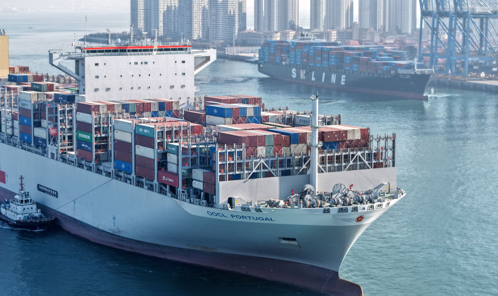 ▲2025年12月4日,货轮进出山东港口青岛港前湾港区。(图片来源:新华社)