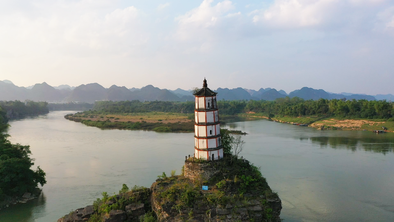 ▲矗立在左江之中的归龙塔。(图片来源:“崇左融媒”微信公众号)